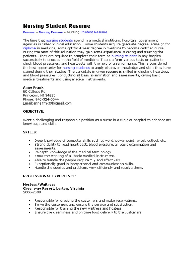To do that, resume expert kim. Because hospitals and clinics have their own equipment, procedures and medical. Nursing student resumes differ in their need for clarity and plenty of detail. Take a look at our student nurse resume sample to know what an ideal nurse student resume looks like. 3700 worth street, dallas tx 75246 nursing_student@baylor.edu.
